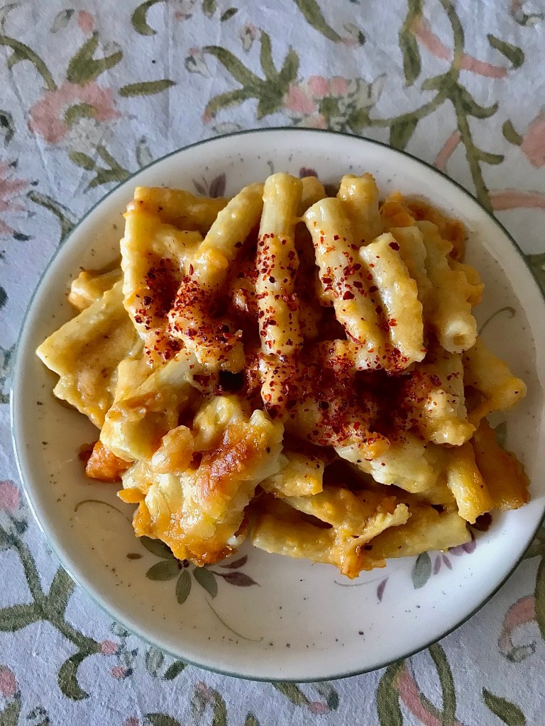 Sweet potatoes are always the last to get used in my veg box because I think I don’t like them even though I do, so I tend to scramble for a recipe. Today I tried Nigella’s sweet potato Mac n cheese. It is delicious. Is this my favourite Mac n cheese? Probably not. But it is a really nice Mac n cheese that has a surprisingly large amount of sweet potatoes. It is most certainly nursery food, and I think would be a hit with people who like a little sweetness in their food or don’t want a giant bowl of really super rich pasta. You can use non dairy butter and oatmilk to make the white sauce and any nice melty, flavourful non dairy cheese here. Be sure to pick a non-dairy/dairy cheese mix that has some bite and don’t skip the mustard (Nigella recommends feta and mature cheddar), as this balances the sweetness of the sweet potatoes. In case you think you can skip a step and just eat it after making the white sauce or just microwaving it, no. It needs to be baked. It is not awesome unbaked. It is MUCH nicer baked. Here is the link to the recipe: