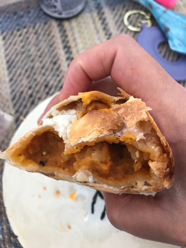 I’m always glad for potatoes in my veg box because they are my favourite. Today I tried something different with my usual aloo recipe that I make about once a week (I have 3 potato recipes that sit in rotation: this aloo one, colcannon, and Anna Jones’s Greek potatoes). I decided to make a pasty with it, but instead of faffing around making pastry or buying pastry, I used frozen parathas. I saw this on Instagram and it is absolutely GENUIS. First of all, parathas are so much yummier than any pastry with this stuffing. Second, parathas are individually wrapped and defrost in less than a minute which is awesome. Third, they are just way easier to manage than pastry. All you do it wait a minute or to for the parathas to defrost and be a bit flexible (keep them on the plastic) jam your cold filling on half of the circle of paratha trying not to be too greedy because you still have to fold and press, and then use the plastic to fold the paratha in half and pinch the edges to close. Lay the ones you want to bake on a tray and brush with egg or milk or whatever for a golden top and bake at 200C/400f for about 20 mins or until golden. Put the rest in the freezer until you are starving again. Done and done.