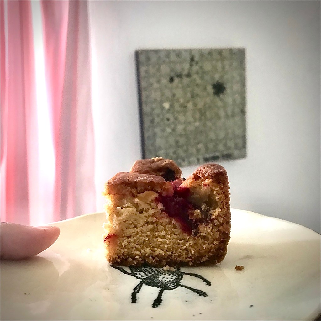 In anticipation of it getting extremely hot, I did some midnight baking when it was cool. Also I knew my friend and I would want cake to graze on when we were hot and bored and sick of salad. Also I had gorgeous veg box plums I needed to use and so I figured I would make Smitten Kitchen’s dimply plum cake, since what a horrid heat wave calls for is a naked cake that can sit on the kitchen table and two people can nibble away at over the course of a few days. This is a lovely cake for bored hangry people with plums and a busy kitchen table. Here is the recipe. I used the butter and eggs, but a non-dairy butter would work and I suspect a flax egg sub would work, but I haven’t tried it. Here is the link to the recipe: