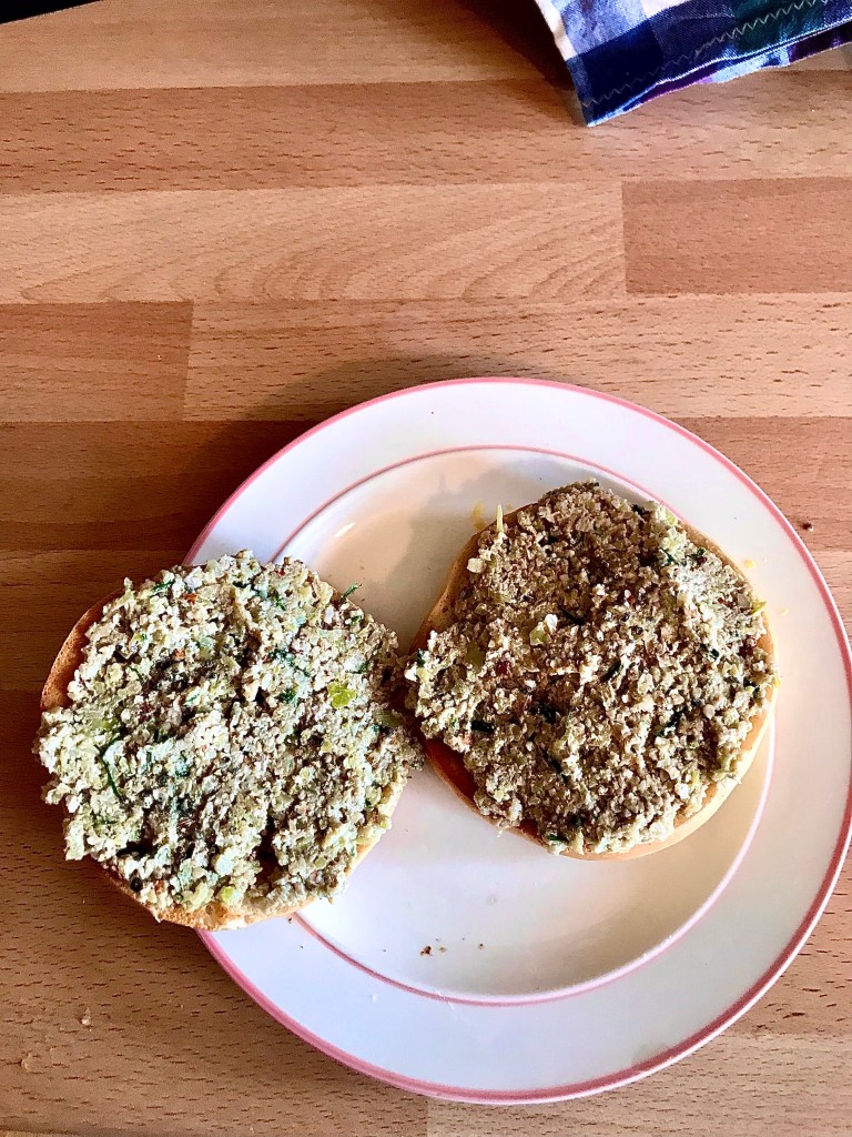 I had a tiny broccoli in my veg box which was perfect for some broccoli carrot peanut noodles, but I wanted a use for the large stalk I had leftover. I decided to make a nutty, sorta cheesy, vegan spread for bagels/toast. It isn’t a looker, but it is rather nice! Here is what I did.