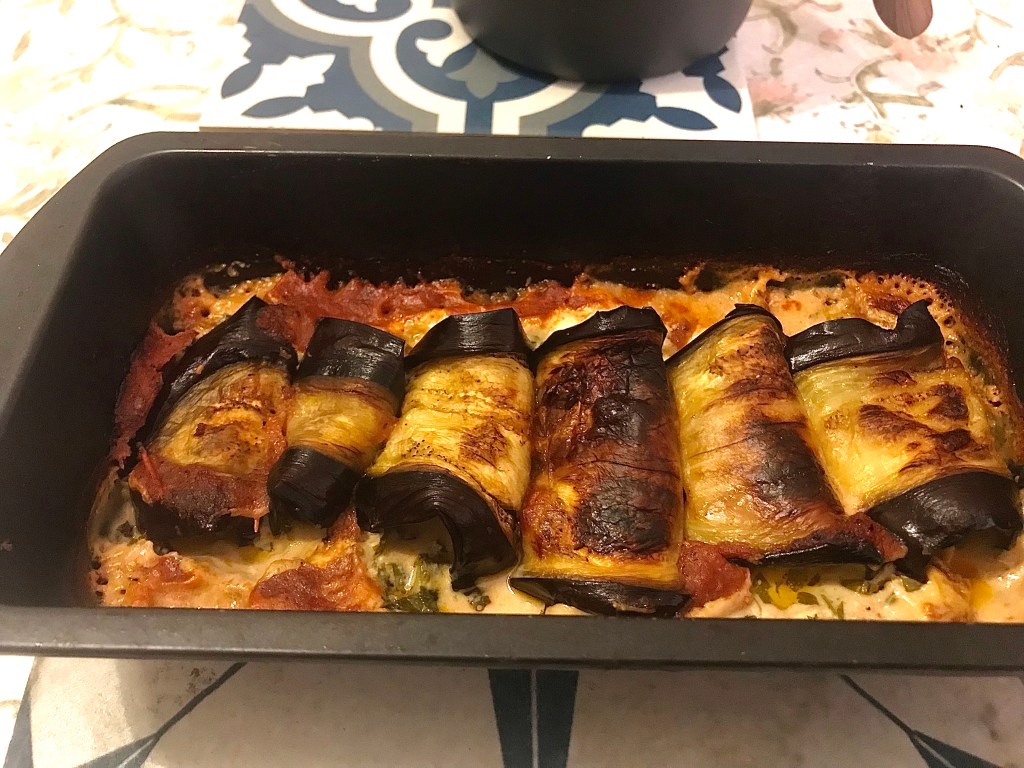 Set your oven to 200C/400F. Slice your aubergine/eggplant into generous 1/4-inch-thick slices and arrange on baking sheets. Brush lightly with olive oil and season well with salt and pepper. Roast for about 10mins and then flip slices and repeat on the second side for another 8 or so minutes until browned on each side. Set aside to cool.
