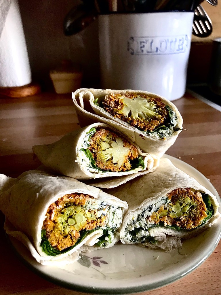 I was so happy when I had broccoli in my veg box because my friend had made the bang bang broccoli recipe in the Guardian and said it was fabulous. I decided to try it and indeed it was fabulous! It is easy and delicious and vegan (you can use whatever milk you want) and gf (you can use chickpea/gram flour and gf breadcrumbs). I ate the first round like nuggets and dipped them in whipped feta. I had the second round as you see here in wraps with whipped feta. It would also be great with hummus or any other delicious dip. Here is the link to the recipe:
