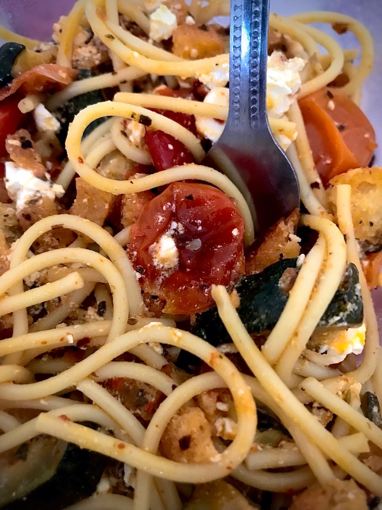 Continuing on the fast and easy pastas with yummy crouton topping, I made this one from the lovely cherry tomatoes and courgette/zucchini in my veg box and tossed it with a bit of feta and a splash of orange juice from the oranges in my box. So good. Here is what I did.